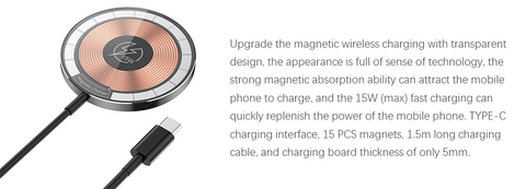 15W high-power intelligent fast charging, strong power, no need to wait, strong magnet adsorption, no fear of shaking and falling, instant sticking and suction, aviation aluminum alloy with acrylic panel brings comfortable texture, split flow temperature control, no heat and easier to use.